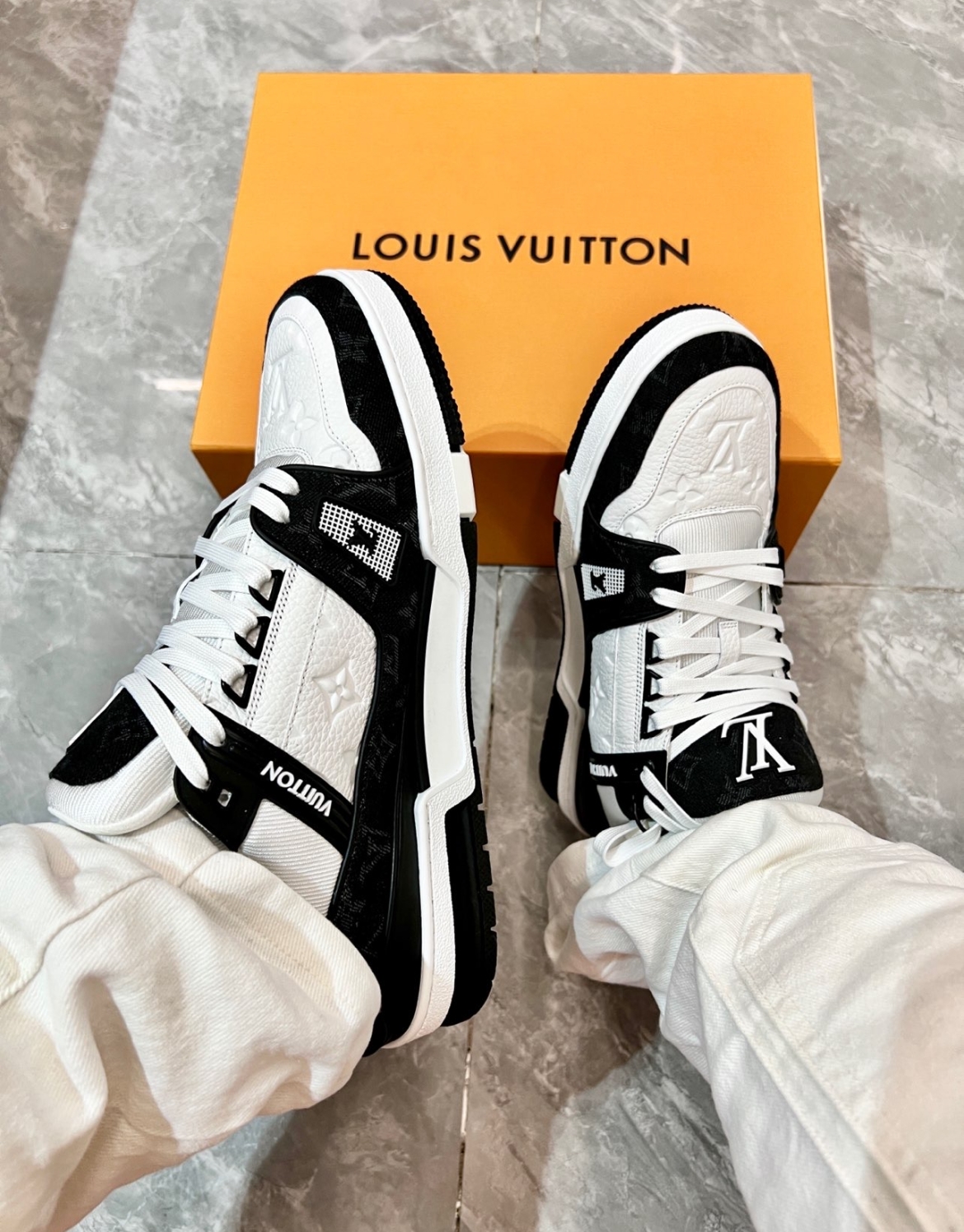 The LOUIS VUITTON TRAINER SNEAKERS IN WHITE AND BLACK – LSVT341 replica captures the sleek, contemporary style of Louis Vuitton's iconic trainers. Featuring a timeless combination of white and black colors, the sneakers mirror the original’s unique design with precision, down to every detail, including the embossed Louis Vuitton logo on the side and heel tab.• Material Specifications:
