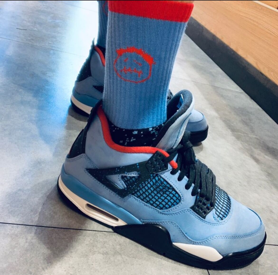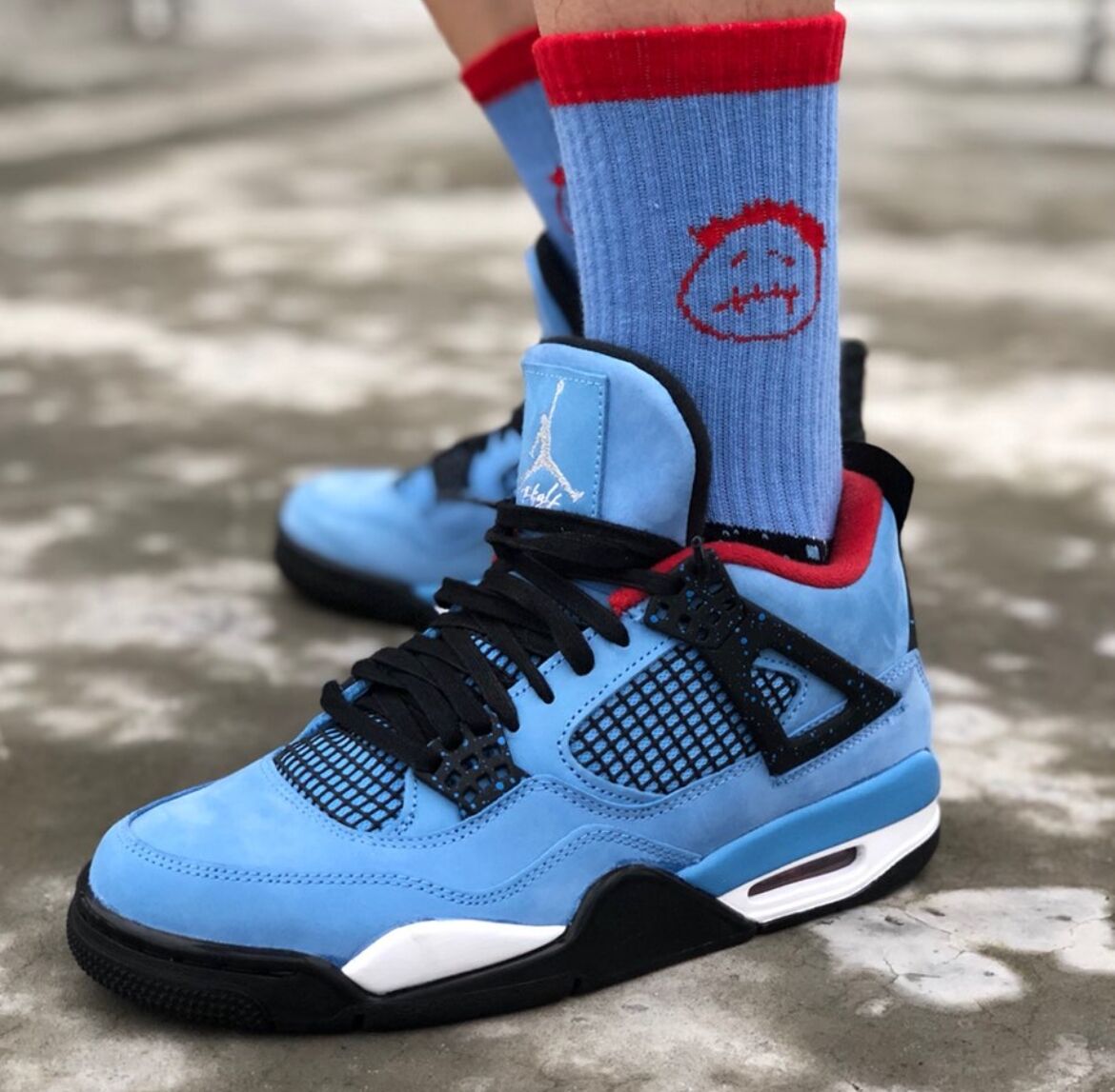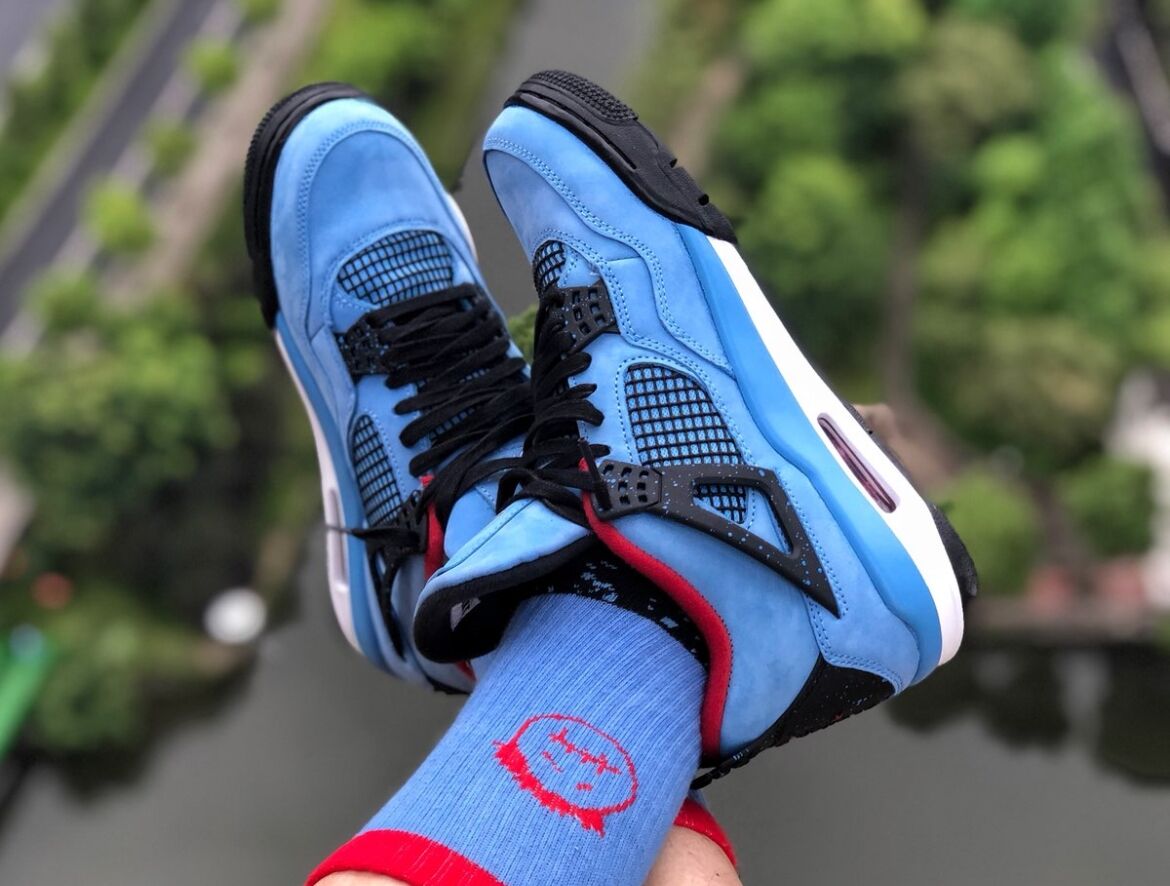 The Air Jordan 4 Retro Travis Scott Cactus Jack pays homage to Houston’s former football team, the Oilers, with a striking University Blue Durabuck leather upper. This colorway mirrors the team’s iconic red, white, and blue uniforms, featuring a Varsity Red insole and black lace cage. Air Jordan 4 Retro Travis Scott Cactus Jack has a light blue speckle pattern decorates both the lace cage and heel panel. Cactus Jack branding in Varsity Red adorns the left heel, while a matching Jumpman logo appears on the right, completing the tribute to Travis Scott’s hometown.